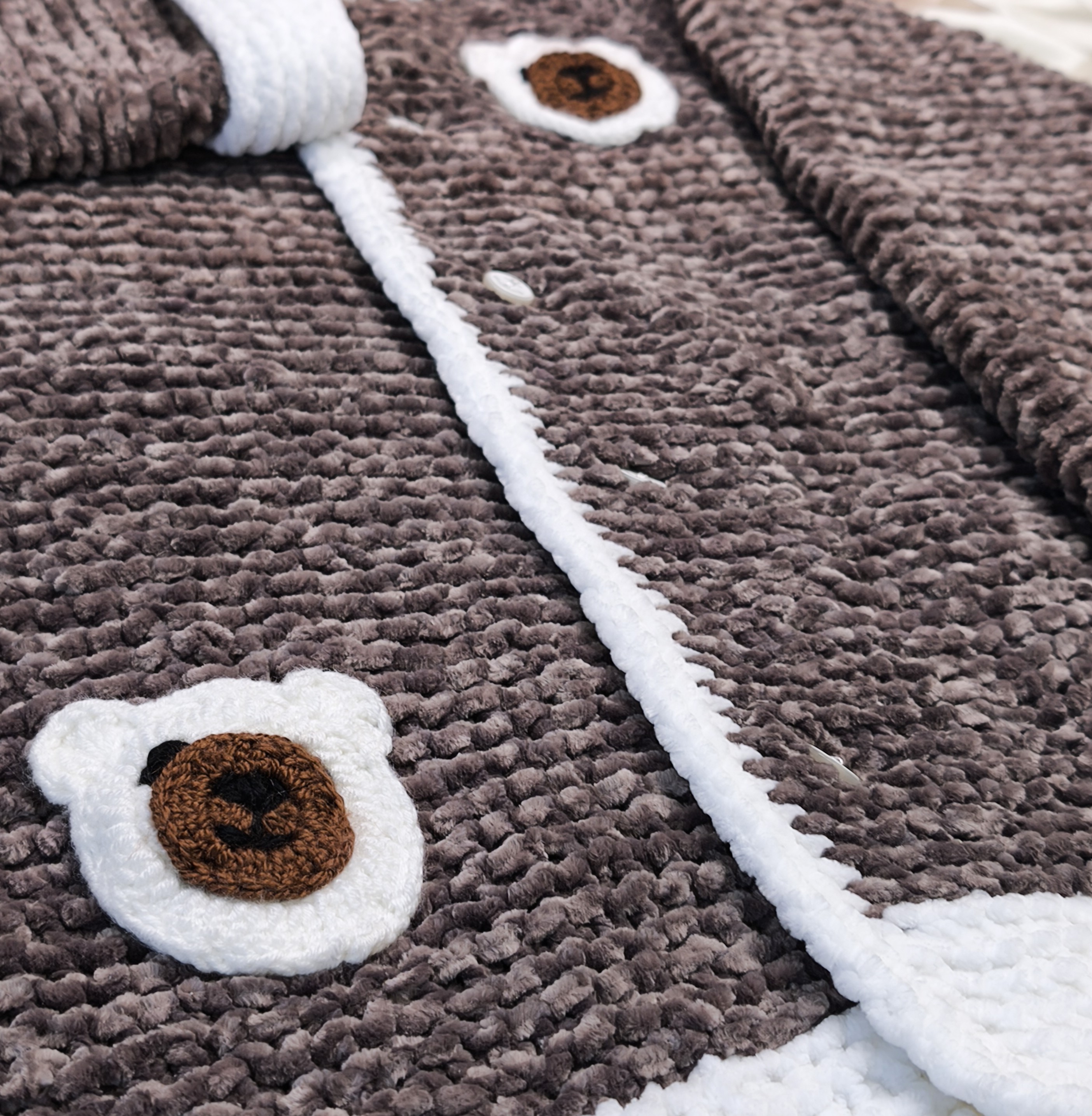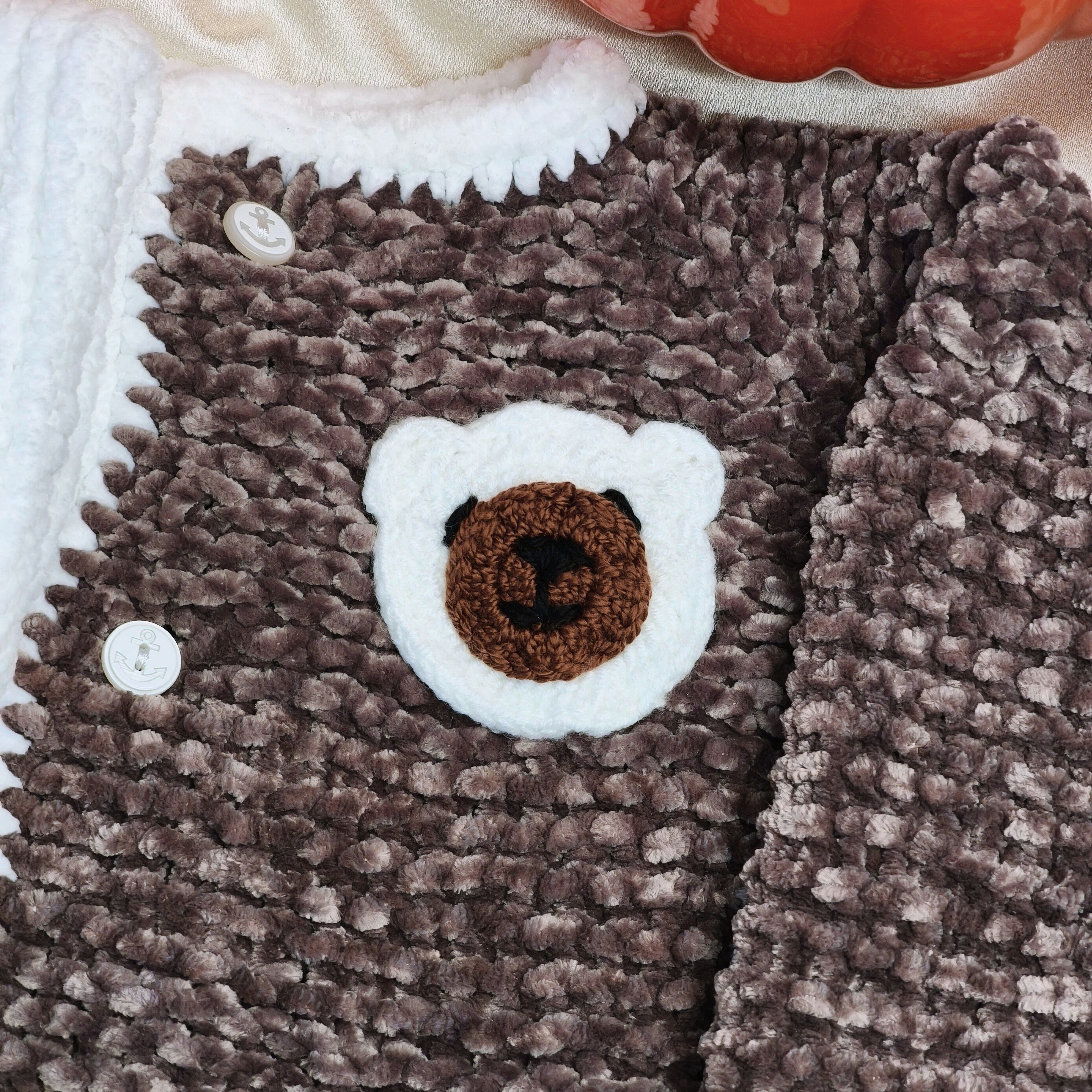 Çocukların enerjisine ayak uyduracak kadar rahat, görünümüyle de sevimli bir parça! Kahverengi yumuşak dokusu ve ayıcık motifleriyle tasarlanan bu el emeği hırka, 4-5 yaş çocukların gardırobuna şıklık katıyor.