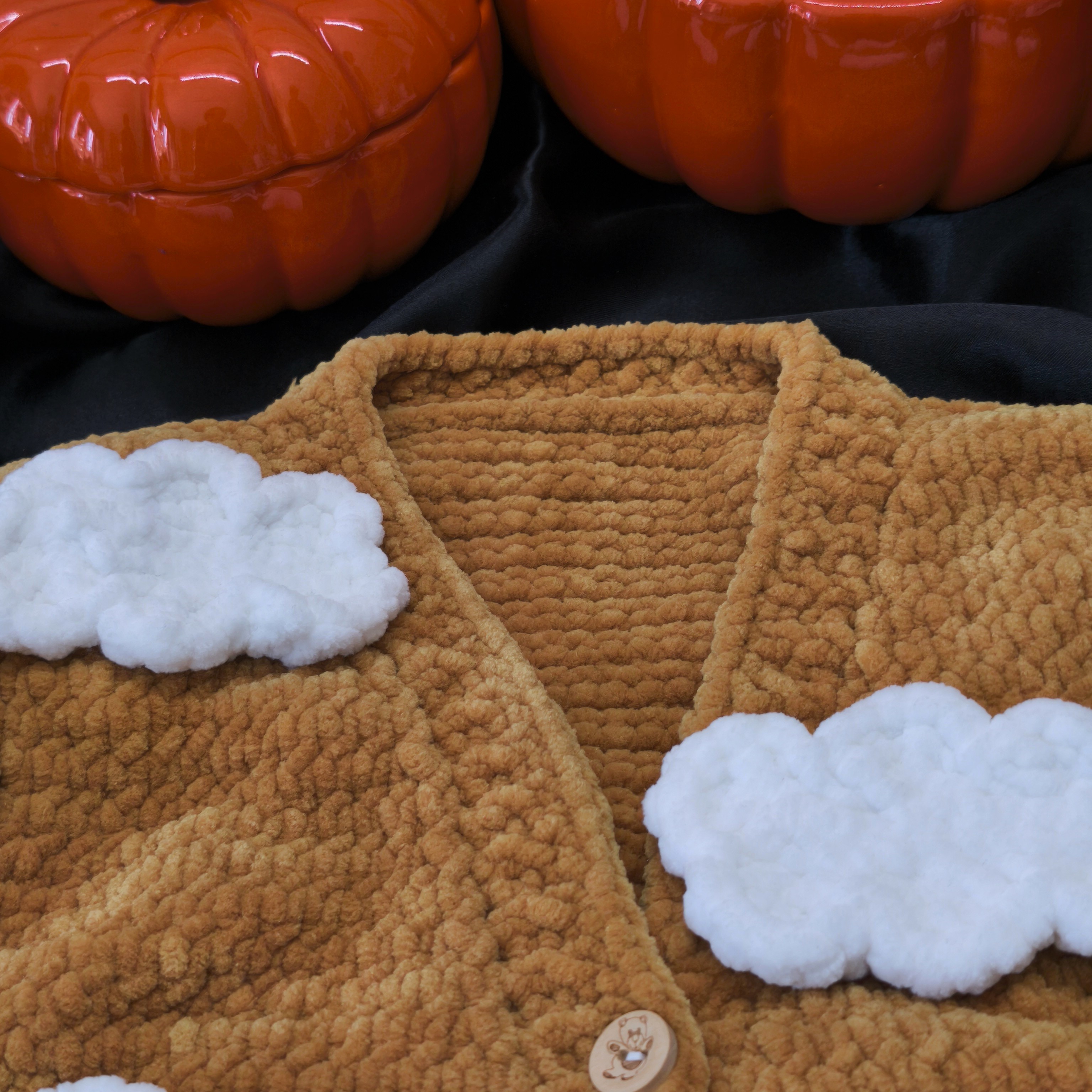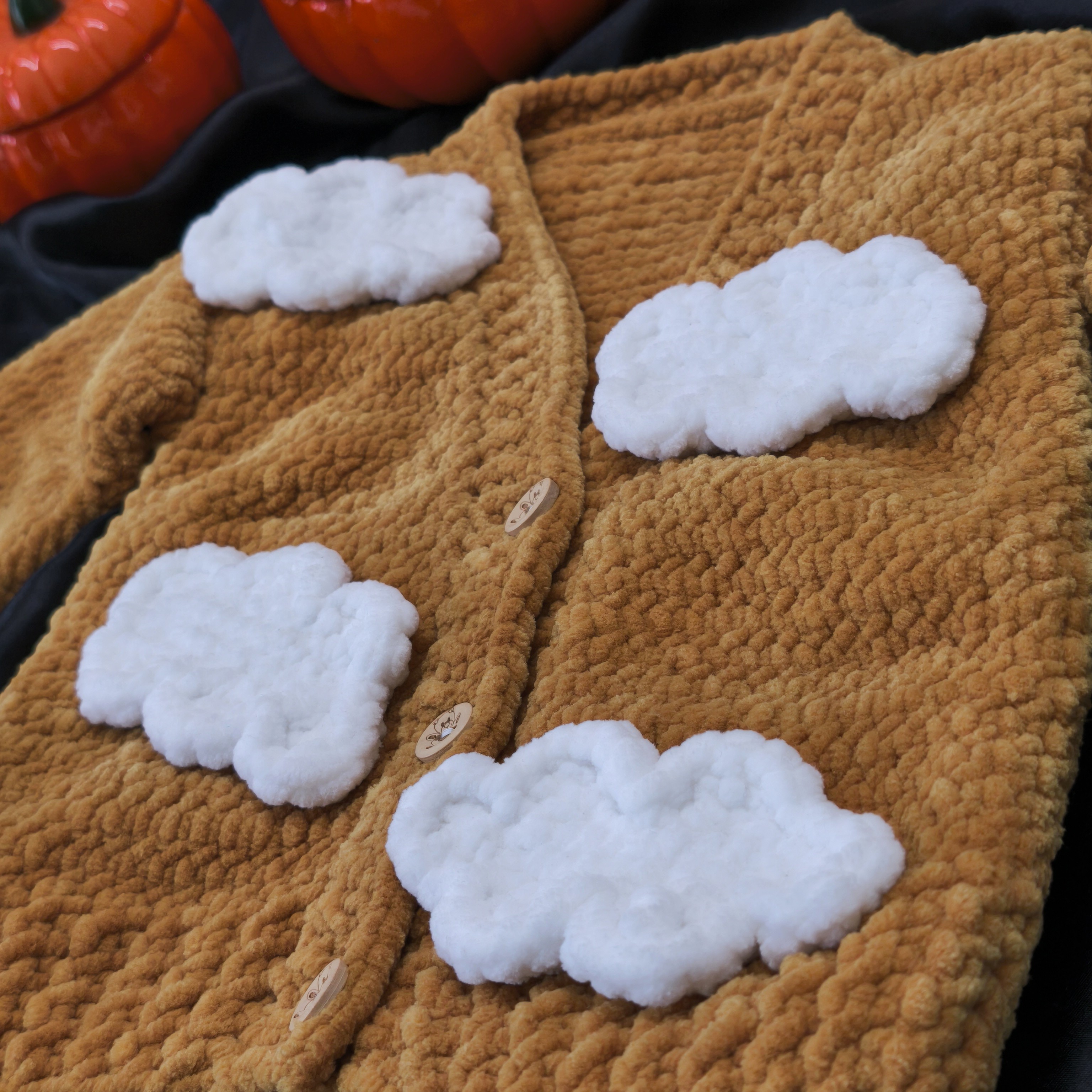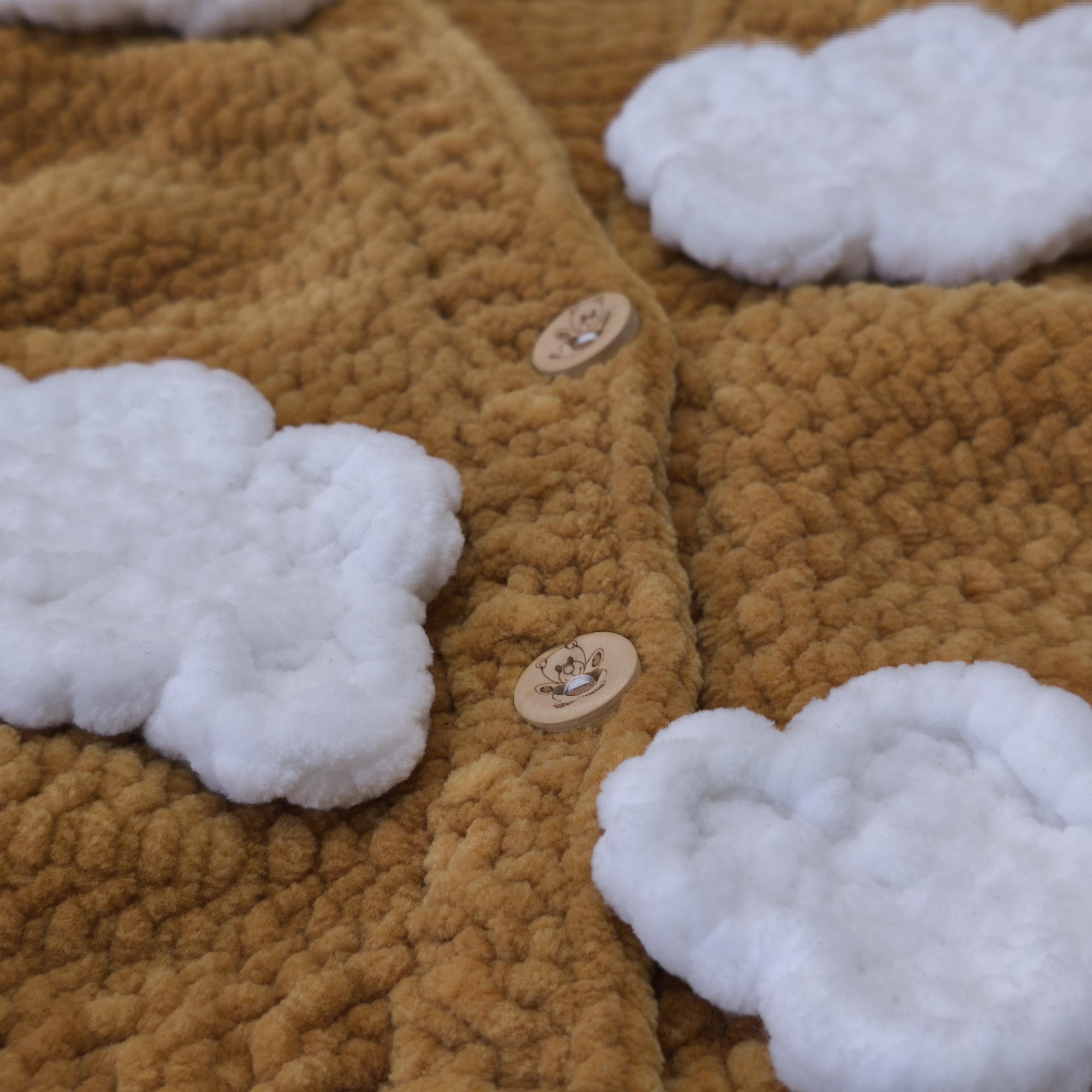 Kahverengi Beyaz Bulut Detaylı El Yapımı Yeni Doğan Hırka, doğadan ilham alan sıcak tonları ve sevimli bulut süslemeleriyle hem huzurlu hem stil sahibi bir bebek parçasıdır.