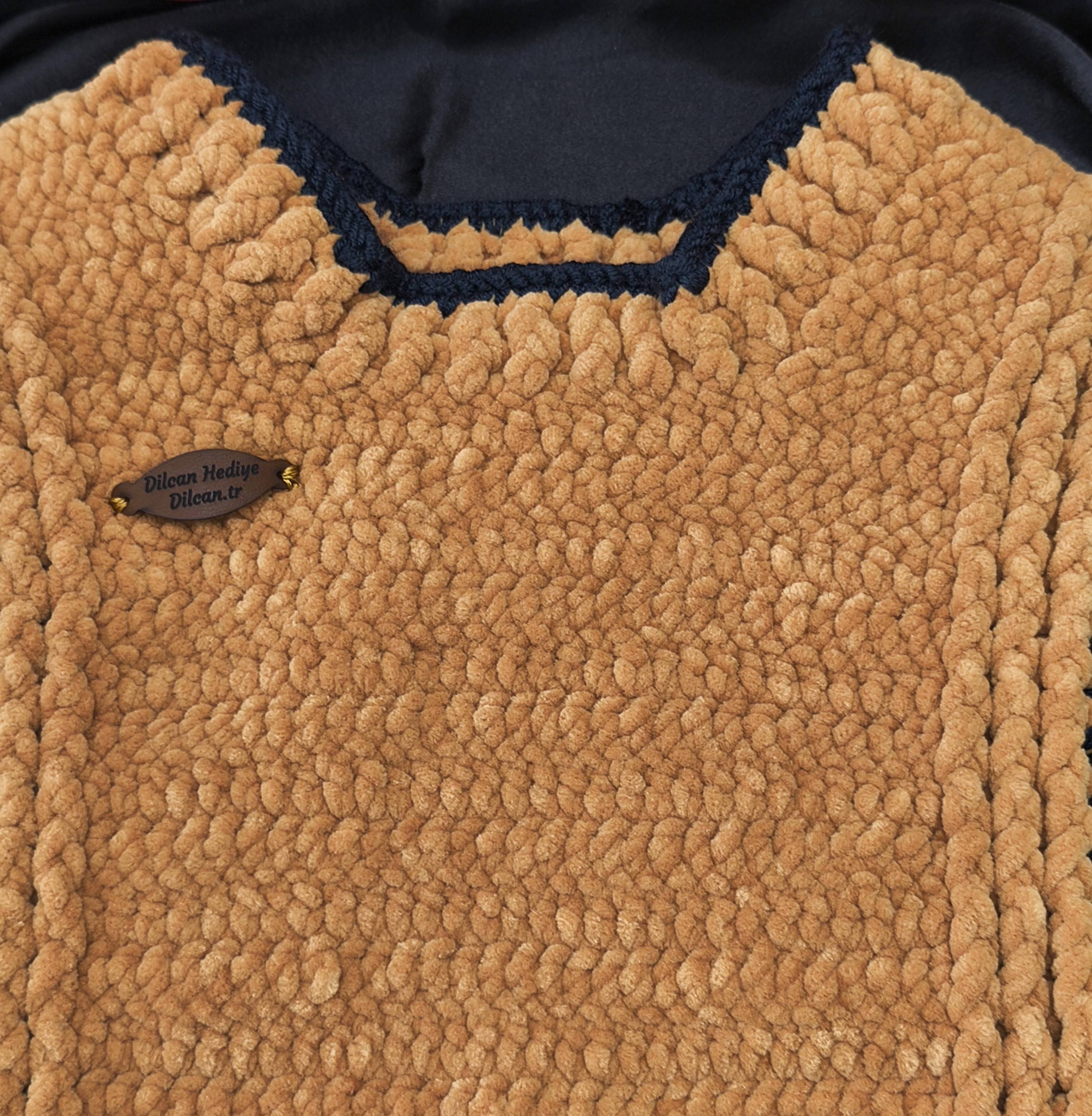 El Yapımı Kahverengi Yeni Doğan Süveter – Lacivert Cep Detaylı, sadeliğin ve zarif detayların mükemmel uyumunu taşıyan özel bir tasarımdır.