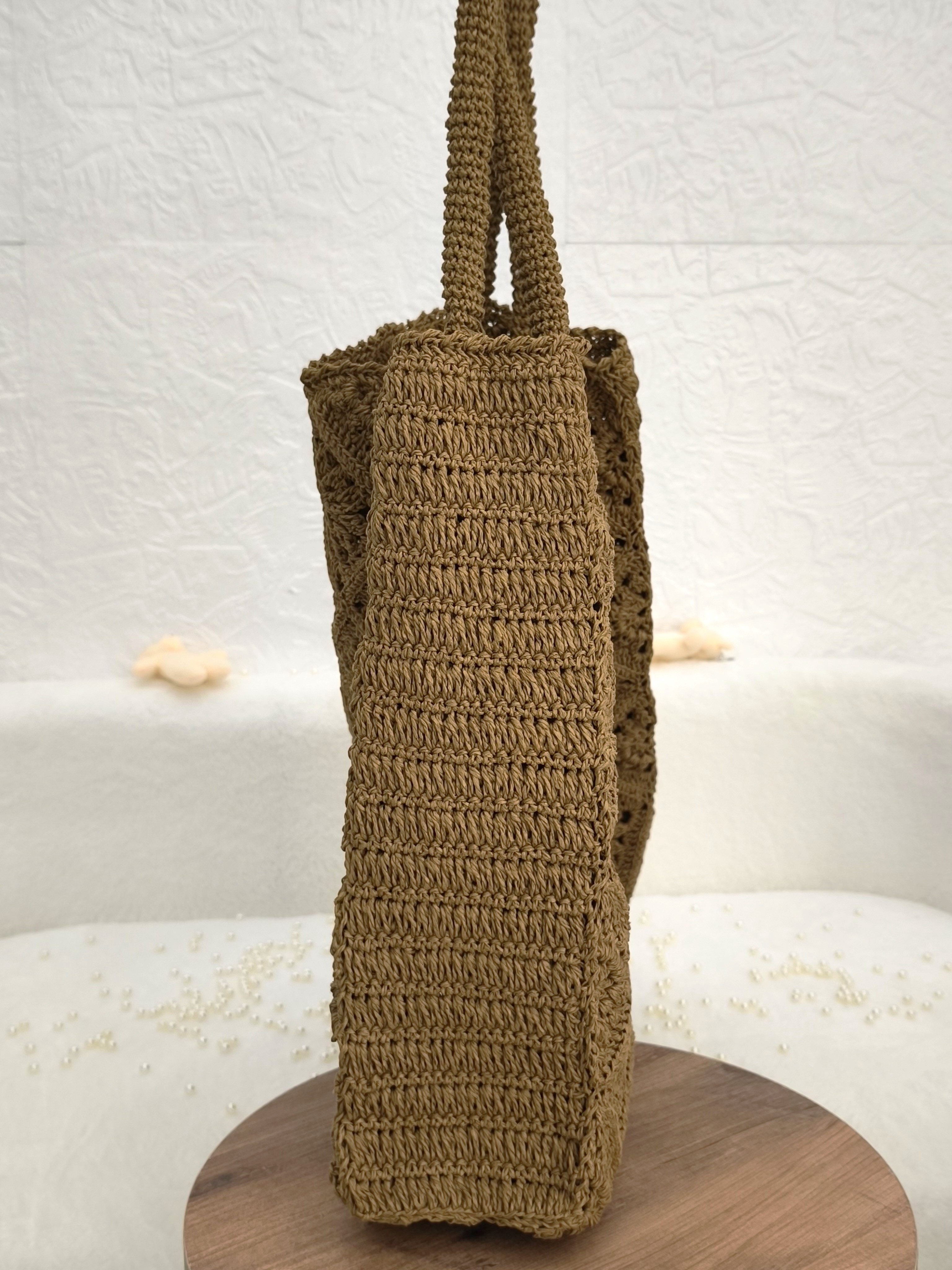 El emeği, hasır görünümlü kağıt ipten örülmüş battal boy plaj çantası. Yaz tatillerinizde, sahilde, havuz kenarında veya günlük kullanımda şıklığınızı tamamlar.