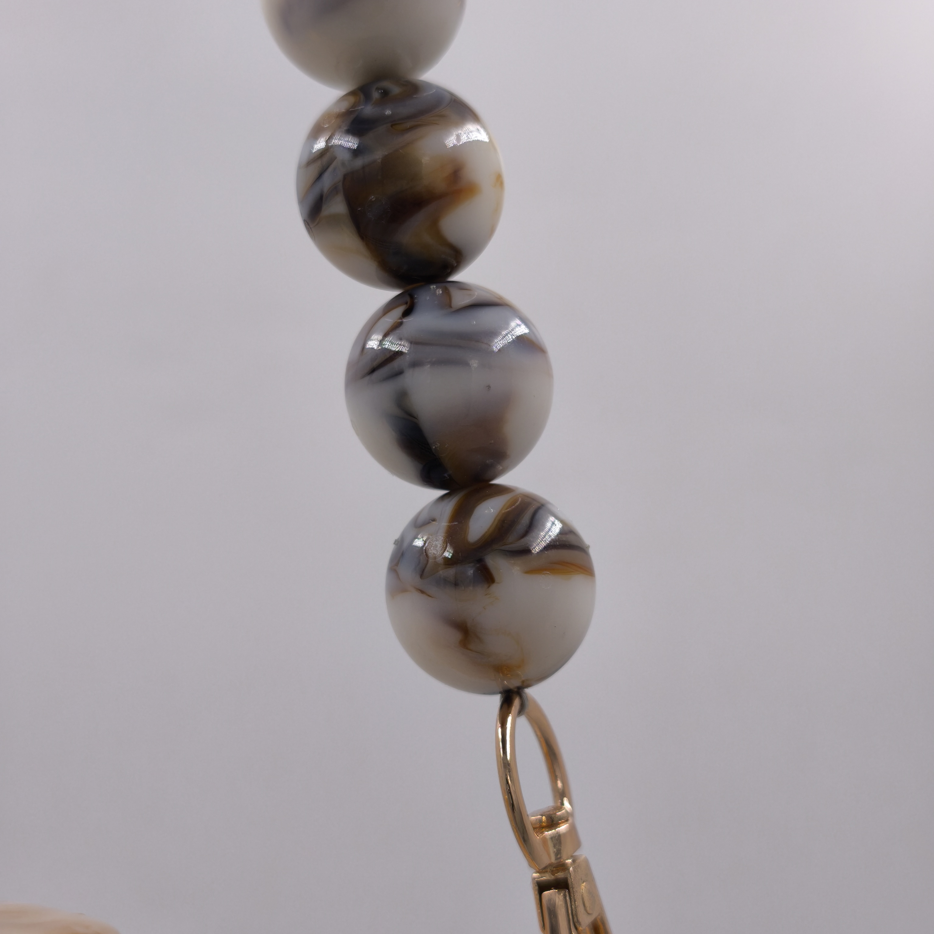 El emeğiyle örülmüş bu şık burslu çanta, klasik ve modern tasarımın mükemmel birleşimini sunuyor. Kahverengi-beyaz tonlarının uyumuyla hazırlanmış örgü dokusu, ahşap çerçeve ve boncuk detaylı sapla tamamlanıyor.