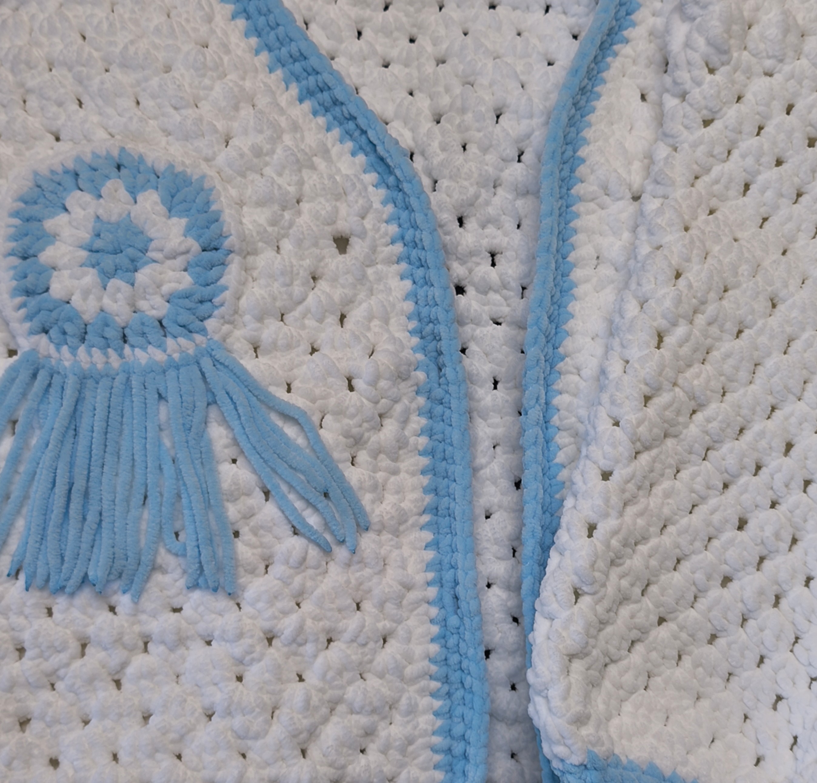 Şıklığı ve el emeğini bir araya getiren bu özel tasarım hırka, beyazın saf güzelliğini mavinin ferah dokusuyla buluşturuyor. El işçiliğiyle örülen motif ve püskül detayları, ürüne özgün bir karakter kazandırıyor.