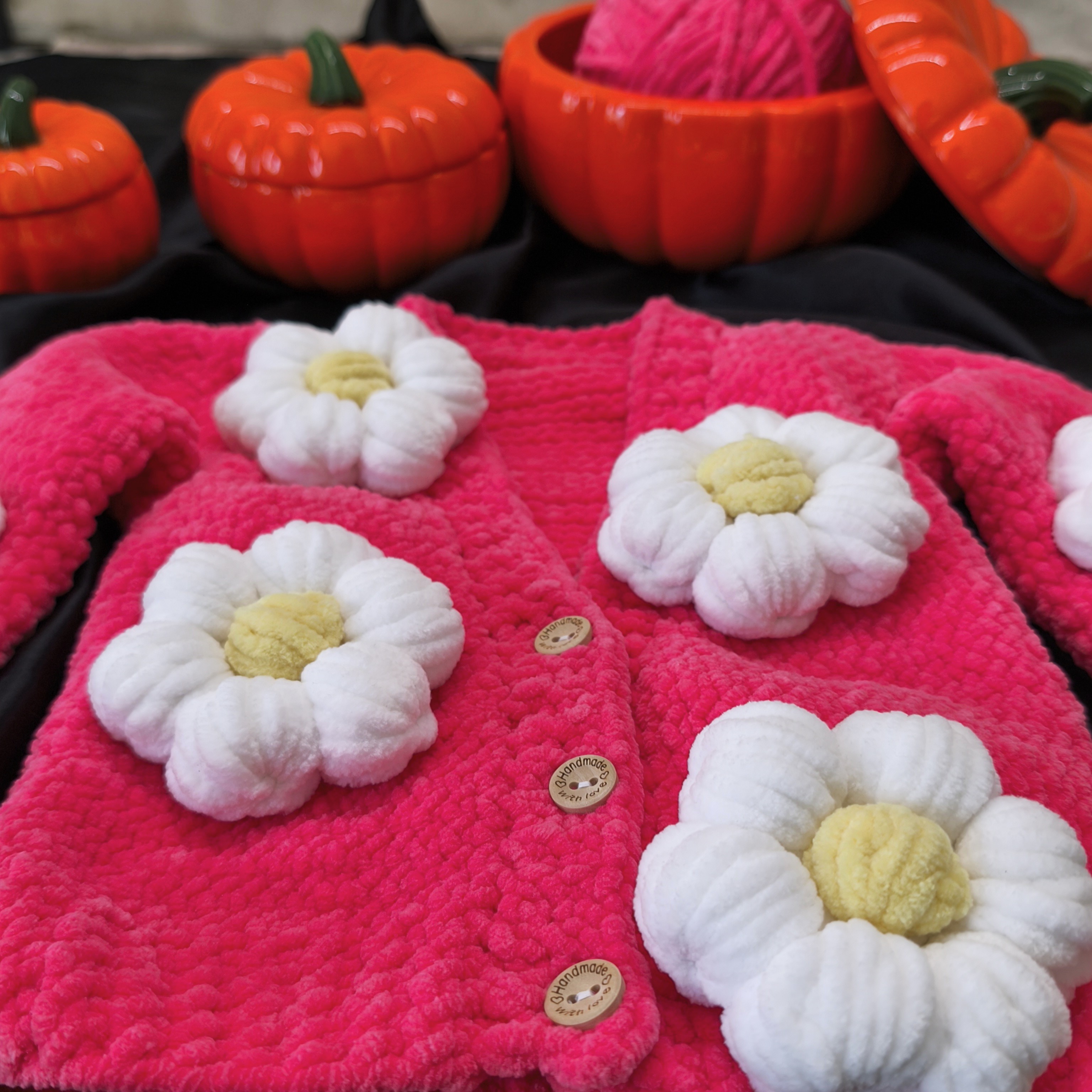 Pembe Beyaz Papatya Desenli El Yapımı Yeni Doğan Hırka, zarif tasarımı ve doğallığıyla bebeğinizin ilk günlerine şefkatli bir dokunuş katmak için özenle hazırlandı.