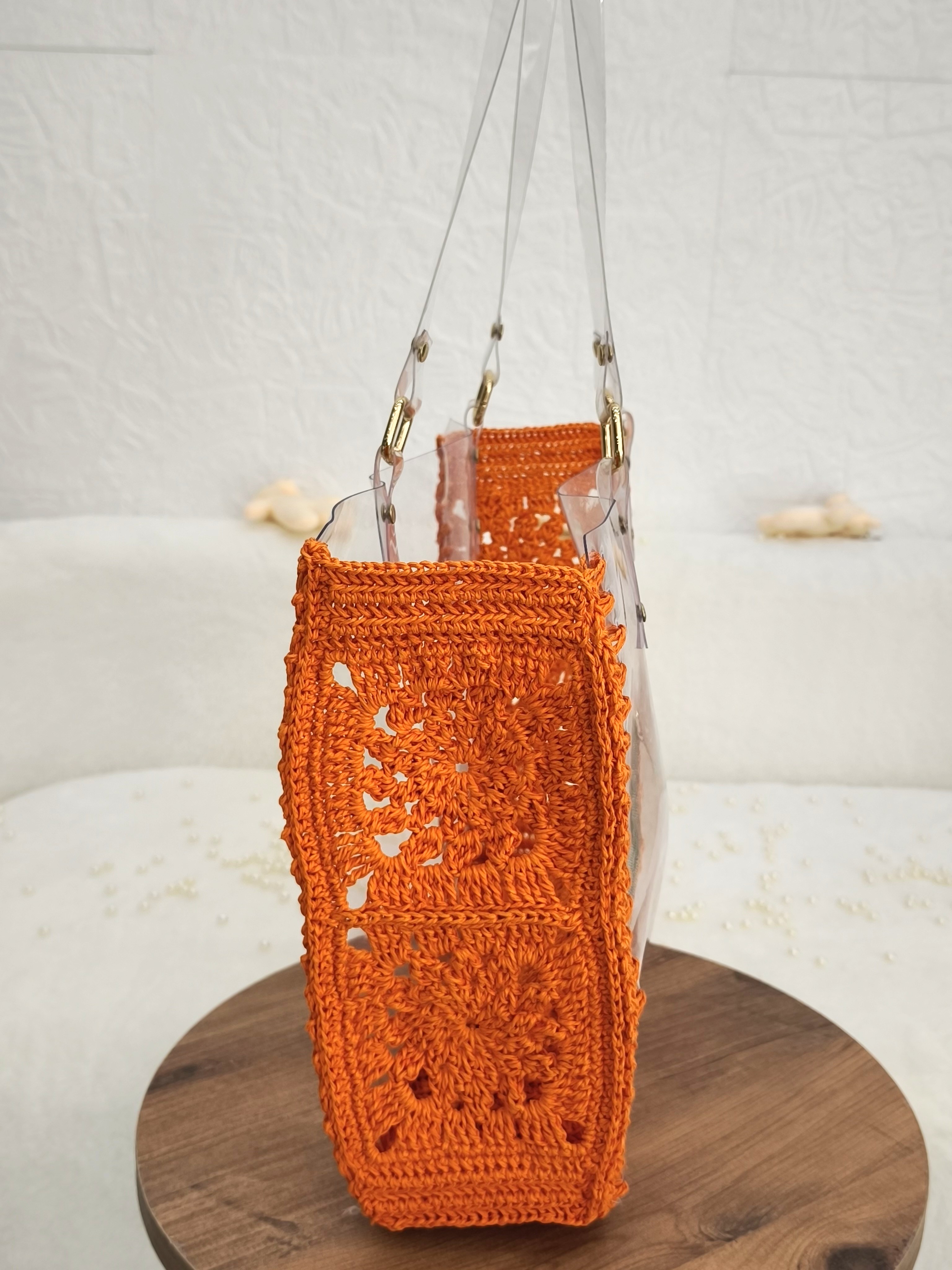 Dışı dayanıklı şeffaf PVC, kenarları ise el örgüsü detaylarla güçlendirilmiştir.